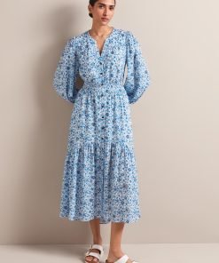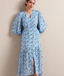 Aspen Cotton Blend Maxi Dress – White Blue Ditsy Carnation Print