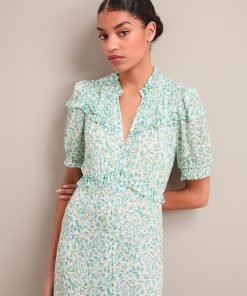 Viola Gold Metallic Fil Coupé Midi Dress – Green Yellow Trailing Feather Print